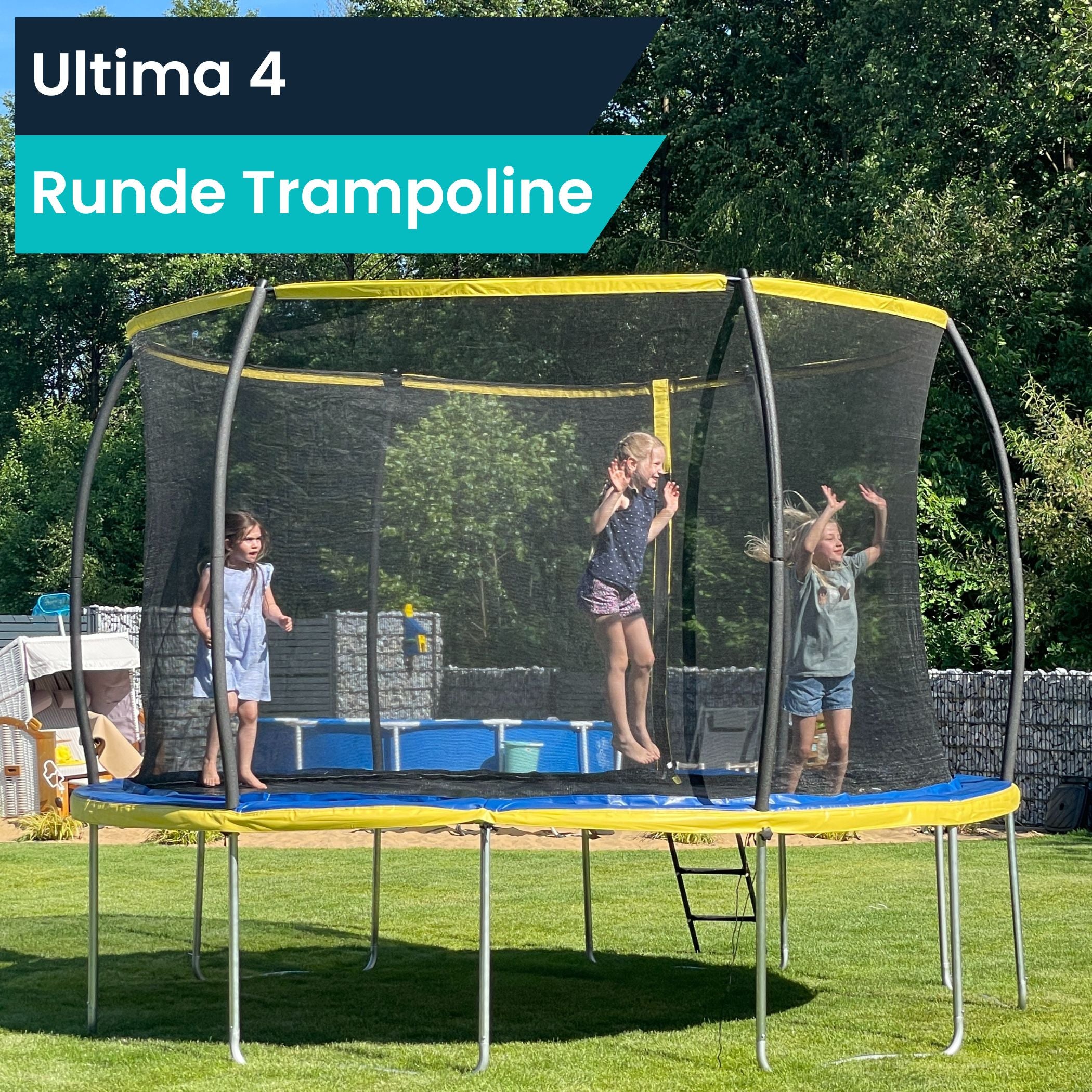 Unsere Trampoline verfügen über eine einzigartige und innovative Rahmenkonstruktion, die es von anderen Marken abhebt. Bei herkömmlichen Trampolinen sind die Haltestangen des Sicherheitsnetzes an den Rahmen geschraubt, was das Ab- und Wiederanbauen mühsam und zeitaufwendig macht, da Werkzeug benötigt wird und eine Vielzahl von Schrauben gelöst werden müssen. Unsere patentierte Konstruktion ermöglicht es jedoch, die Haltestangen des Sicherheitsnetzes einfach in den Rahmen zu stecken. Unser Ansatz hat den großen Vorteil, weil das Sicherheitsnetz samt Haltestangen mit nur wenigen Handgriffen und ohne Werkzeug entfernt werden kann. Bei aufkommenden Stürmen oder starkem Wind kann das Netz schnell abgebaut werden. Das Entfernen und Wiedereinsetzen des Sicherheitsnetzes erfolgt einfach und schnell. Wenn du ein Outdoor-Trampolin kaufen möchtest, dann solltest du diesen Aspekt unbedingt berücksichtigen.